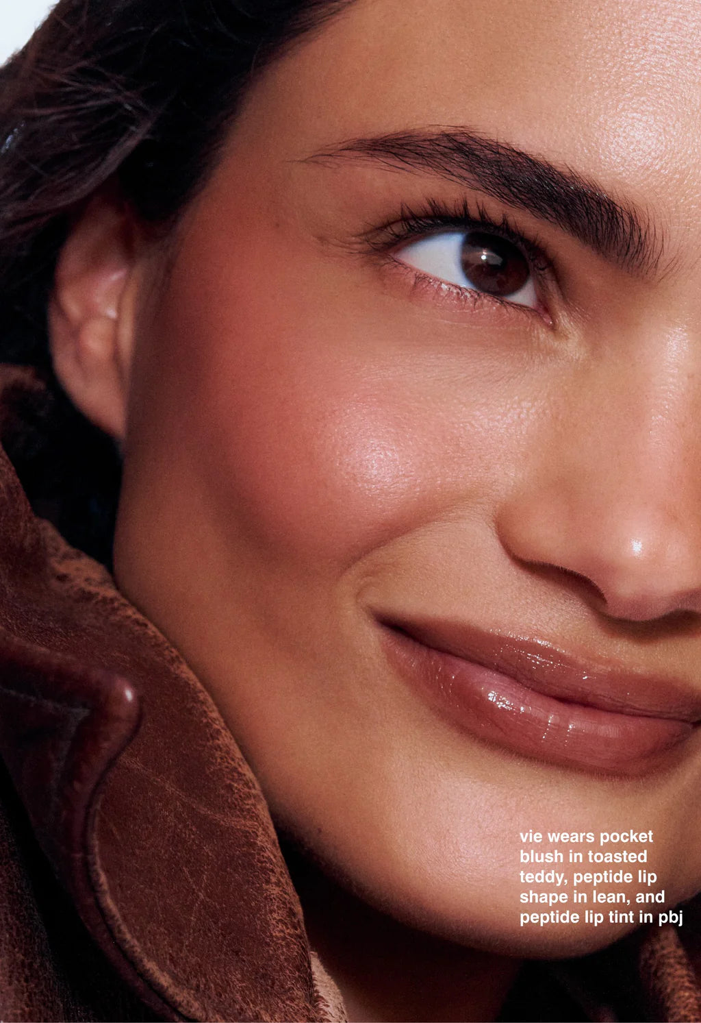 Curated pairings of blush and lip shades for an effortless look with skincare benefits. Pocket Blush wakes up cheeks and lips with a satiny, diffused flush and hydrates skin for baby-soft cheeks. Peptide Lip Shape softly contours lips and visibly enhances lip volume. Peptide Lip Tint melts onto lips for a nourishing hint of tint and a rich, glossy finish.